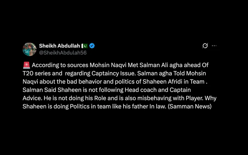 Recently, a post went viral on social media, wherein reports mentioned that Pakistan’s T20I skipper, Salman Ali Agha met PCB Chairman, Mohsin Naqvi, and he complained against Shaheen for doing politics in the team.