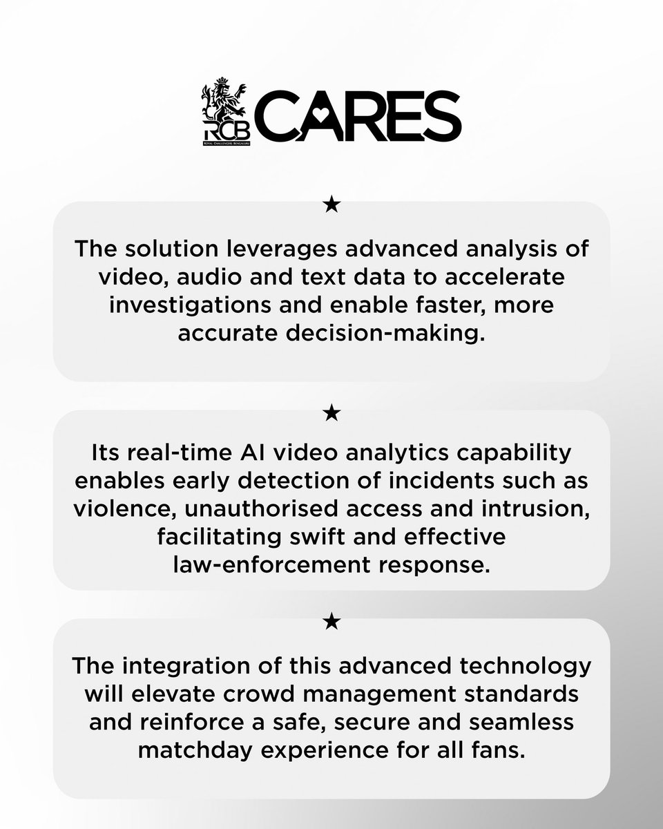 RCB have partnered with Staqu, a technology company known for work in public safety and data-driven monitoring. The system will use facial recognition and intelligent tracking of people, objects and vehicles to improve overall stadium security.