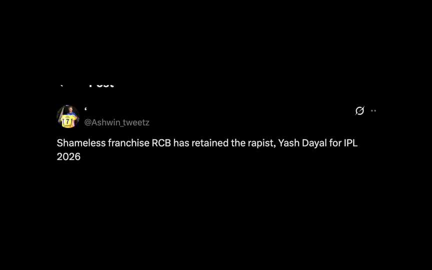 "Shameless franchise RCB has retained the rapist, Yash Dayal for IPL 2026."