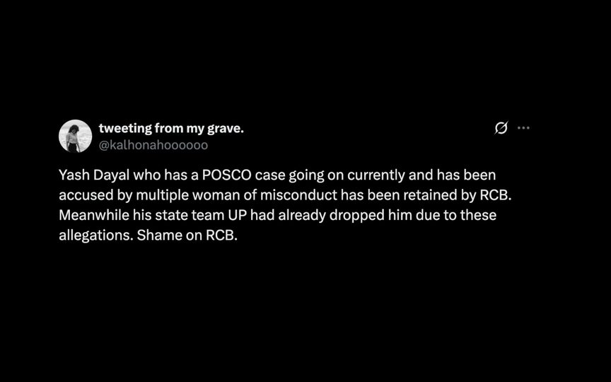 "Yash Dayal who has a POSCO case going on currently and has been accused by multiple woman of misconduct has been retained by RCB. Meanwhile his state team UP had already dropped him due to these allegations. Shame on RCB."