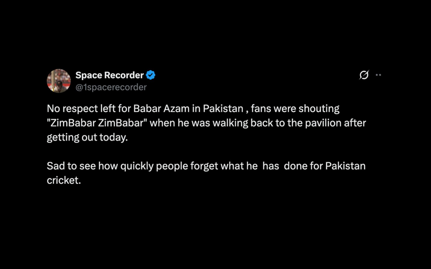 Babar was shell-shocked after his dismissal, and he was dejected as he walked back to the pavilion on Day 1. After his wicket, a video went viral in which some Pakistan fans tore him apart and mocked their own player by chanting “Zimbabar, Zimbabar.”