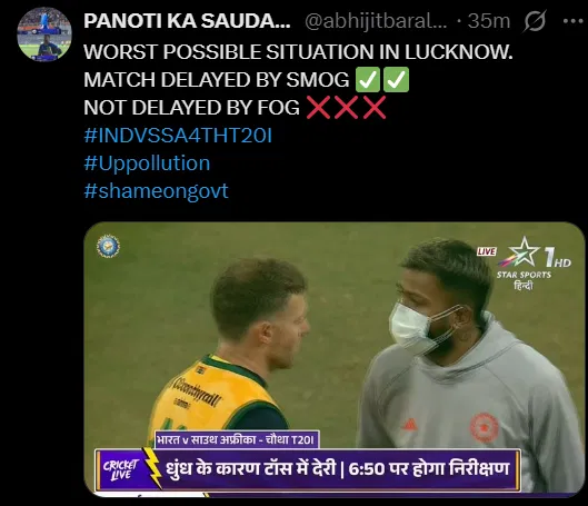 While the broadcasters called it a delay due to fog, journalist Nikhil Naz noted the AQI at the Ekana Stadium to be 490, which is considered as hazardous for health. Fans around the country also expressed their disappointment and pointed out the Board of Control for Cricket in India's (BCCI) poor scheduling of the series, consNorth India's pollution levels during winters.